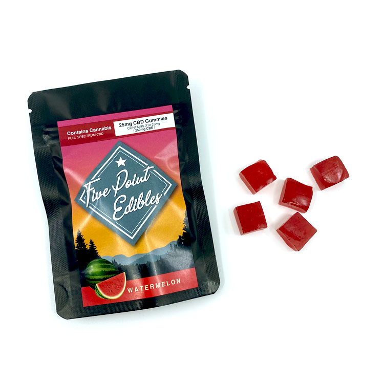 Watermelon-CBD-Gummies-from-Five-Point-Edibles Published January 27, 2021. Size: 750 × 750 in Full spectrum CBD gummies – Five point edibles – 250mg CBD< Previous >